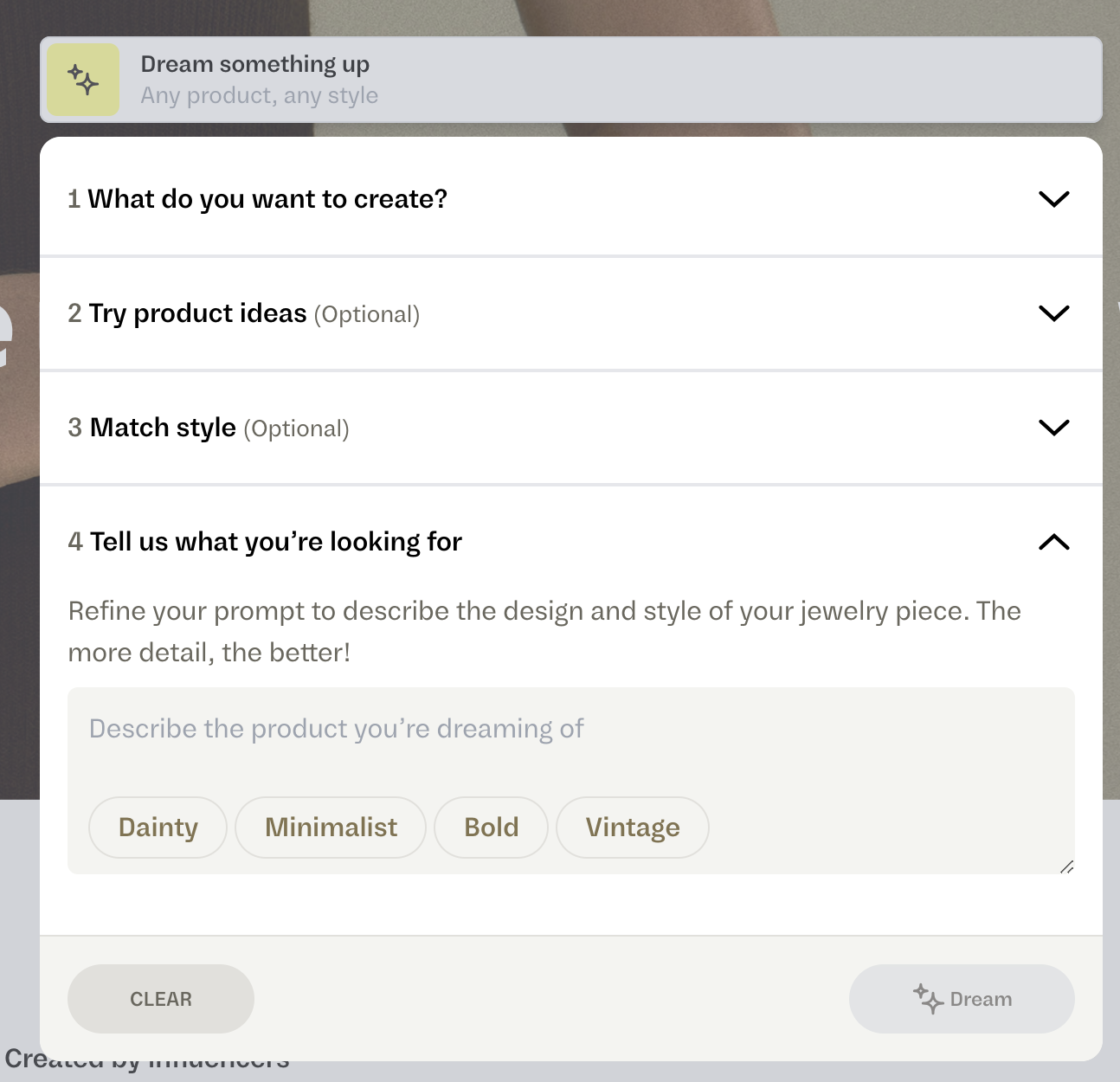 아케이드의 핵심 서비스인 ‘드리머(Dreamer)’는 간단한 텍스트나 이미지 프롬프트만으로 다양한 주얼리 디자인을 만들어 낸다. 내가 입력한 텍스트나 이미지를 AI가 분석하고, 수많은 디자인 데이터를 학습한 뒤 내 취향과 선호도에 맞는 디자인을 제안해 주는데... 한글로 했을 때와 영어로 했을 때... 약간 다른 것 같기도 하고.. 내가 디자인한 건 촌스러운 것 같아.. ㅋㅋ