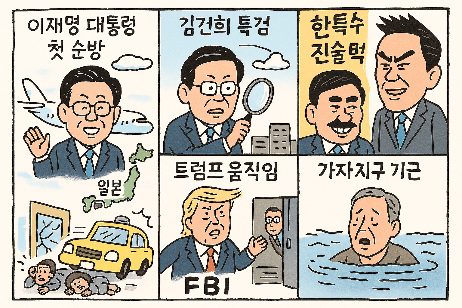 특히 이재명 대통령의 첫 해외 순방은 외교 지형을 바꿀 수도 있는 포인트라 관심 있게 지켜봐야겠고, 김건희 특검과 내란 관련 진술 번복 이슈는 국내 정가를 더 혼란스럽게 만들겠지.