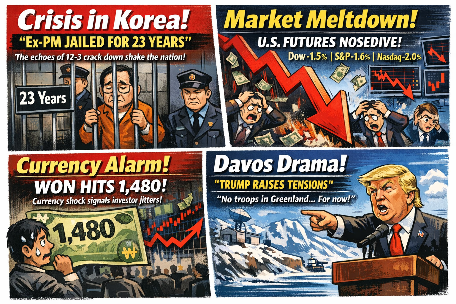 정치는 법원이 흔들었고, 경제는 환율이 흔들었고, 글로벌은 다보스에서 불안이 커졌어.