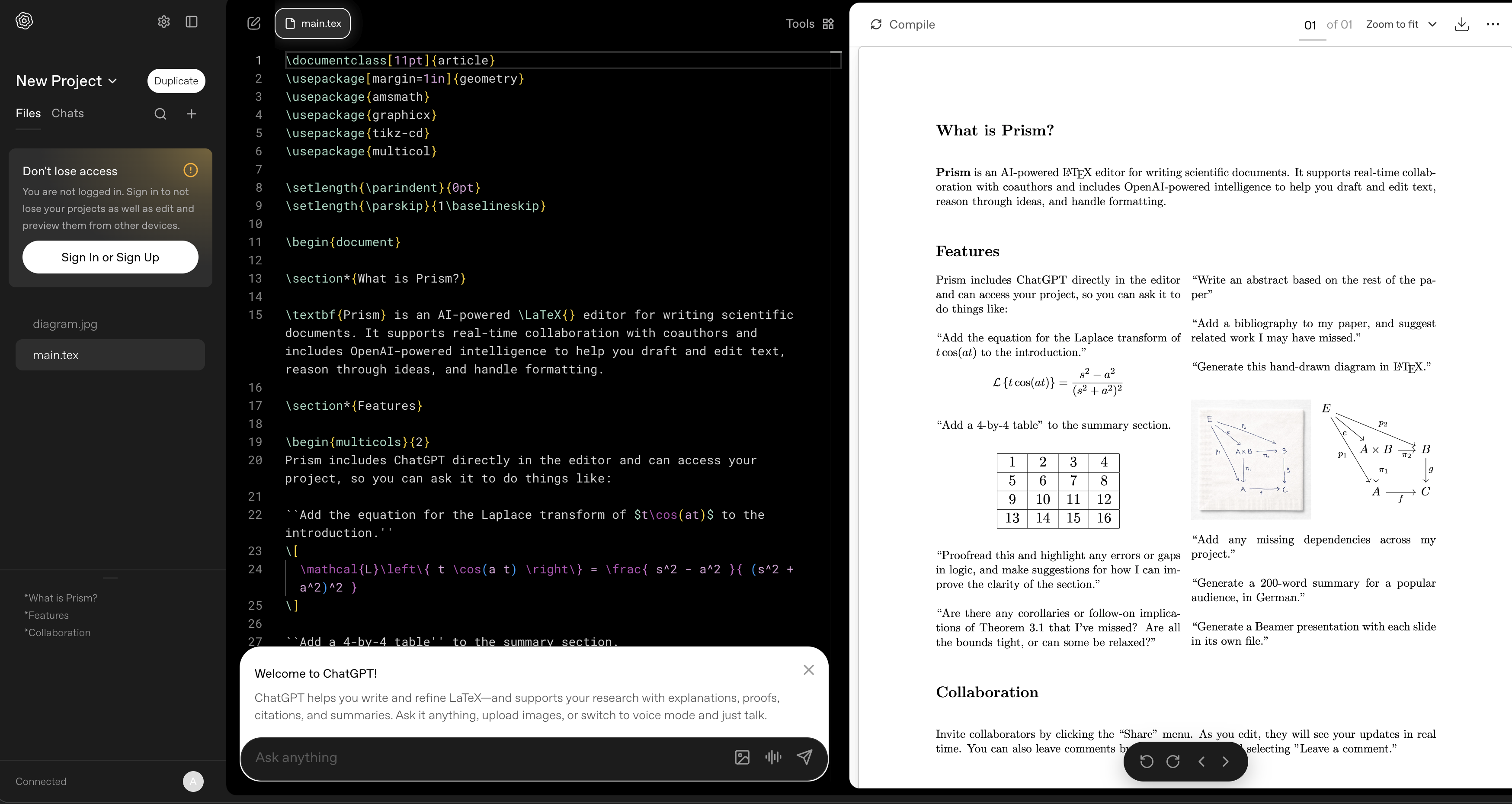 Prism은 ChatGPT 계정만 있으면 바로 쓸 수 있는 웹 앱이야. GPT-5.2랑 깊게 연결돼 있어서, 그냥 질문하는 수준이 아니라 연구 파트너처럼 움직여.