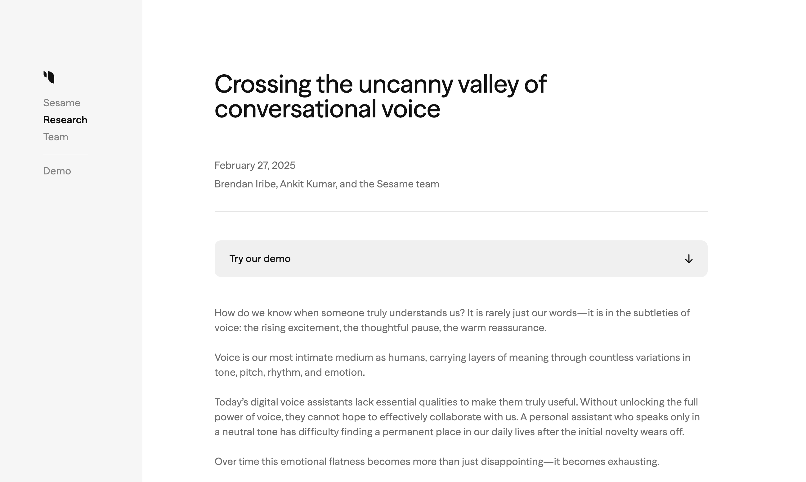 최근 Sesame 팀이 발표한 "Crossing the Uncanny Valley of Conversational Voice" 연구는 AI 음성이 감정을 표현하고, 사람처럼 대화할 수 있도록 발전시키는 방법을 탐구하고 있습니다.