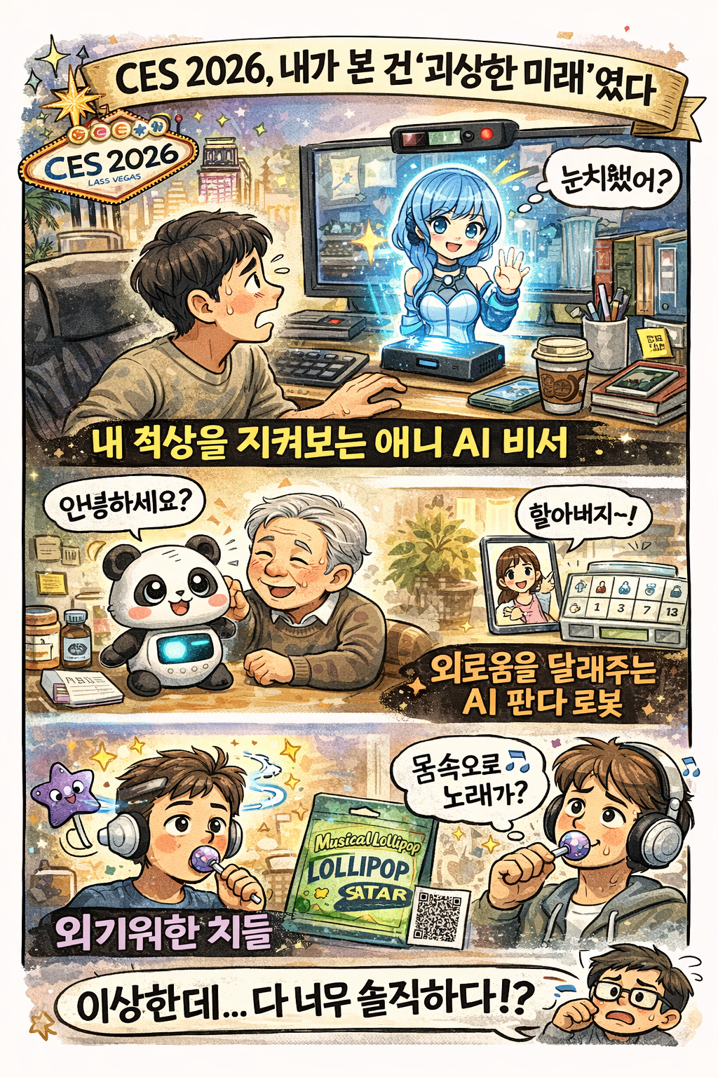 이번 CES 2026의 괴상한 기술들은 농담 같지만, 방향은 정확해. 지금은 낯설어도, 캐릭터형 AI, 정서 케어 로봇, 감각을 파고드는 니치 테크 이런 것들은 생각보다 빨리 “아, 원래 이런 거 있었지”가 될지도 몰라.