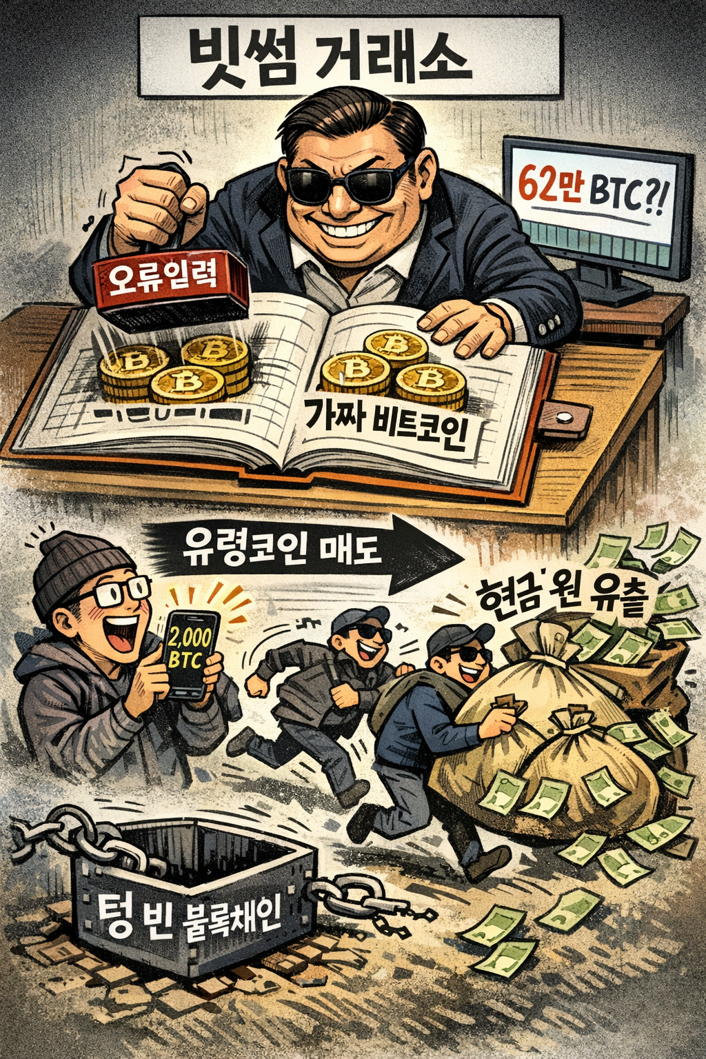 보도들 보면, 빗썸이 실제로 들고 있던 비트코인은 대략 4만~5만 개 수준이었대. 근데 장부에는 많게는 62만 개까지 찍혀 있었던 거지.